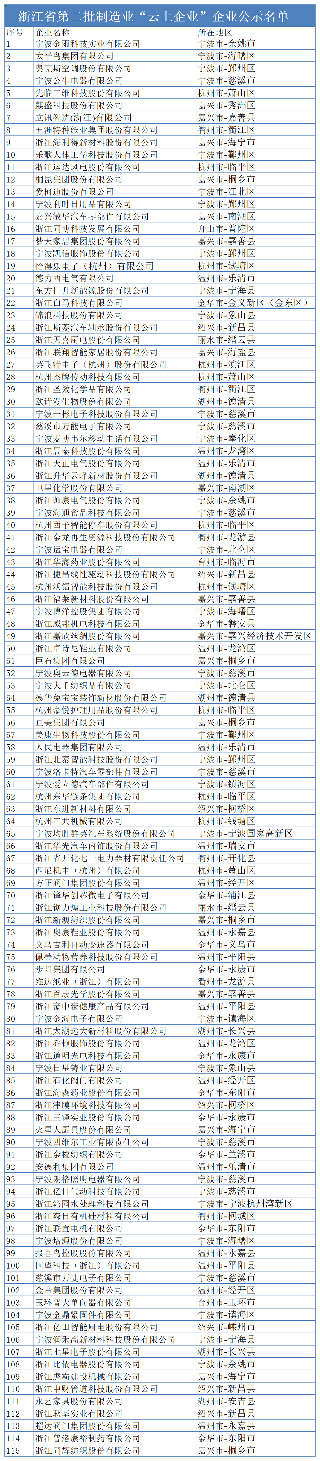 根据《关于组织申报浙江省第二批制造业“云上企业”及市县级制造业“云上企业”培育库入库企业的通知》(浙经信云计算便函〔2022〕92号)要求,我厅对各市推荐的企业进行了审核,经组织专家评审等程序,择优确定宁波金雨科技实业有限公司等115家企业为浙江省第二批制造业“云上企业”,现予公示。