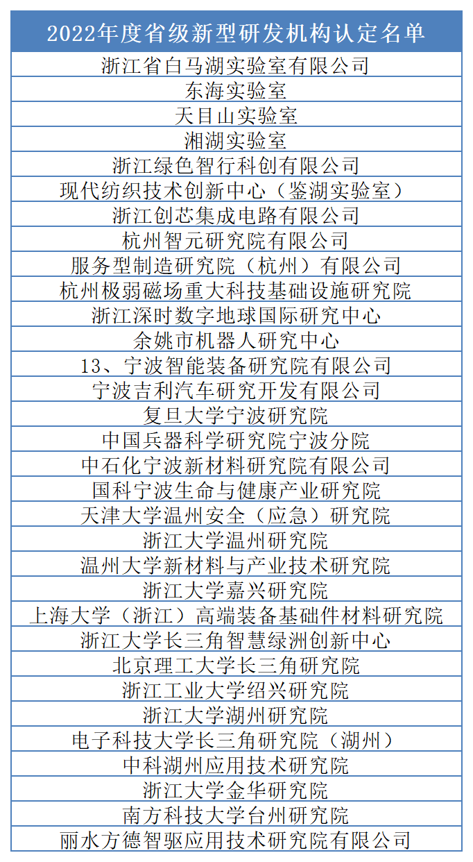 根据《浙江省人民政府办公厅关于加快建设高水平新型研发机构的若干意见》(浙政办发〔2020〕34号),经评估、公示,确定浙江省白马湖实验室有限公司等32家单位为2022年度省级新型研发机构(详见附件)。